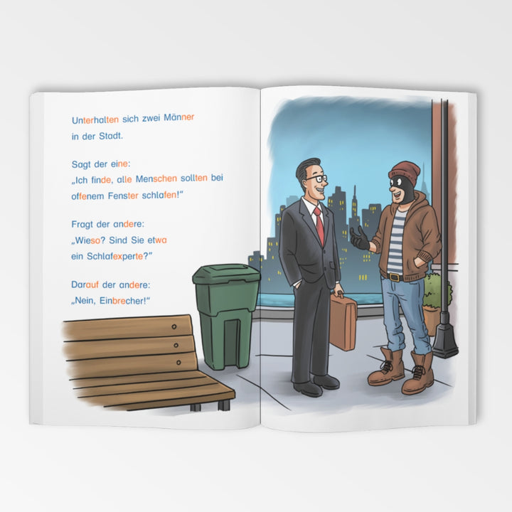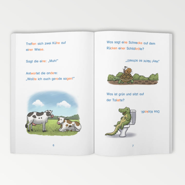 Die Witze sind in Silbenschrift dargestellt, was das Lesen lernen erheblich vereinfacht und Kinder dabei unterstützt, Schritt für Schritt flüssiger zu lesen.